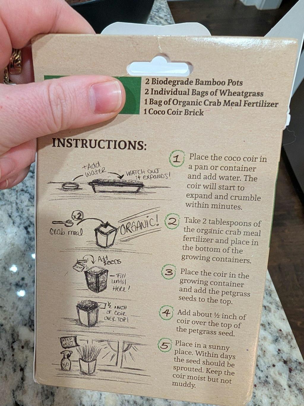 What I received was 1 bag of cat grass seeds, 1 bag of what I thought was the fertilizer, 1 coco coir brick, 2 bamboo pots. I now assume the bag of black pellets was not the fertilizer but catnip seeds because there was maybe only 1/8 of a tsp in the bag. Oh and I did receive a bonus cat toy!